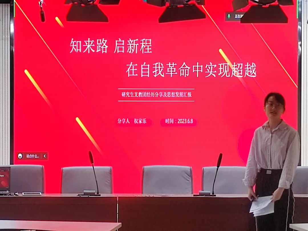 权家乐同志以《知来路,启新程,在自我革命中实现超越》为题进行表态发言。她首先感恩党组织对她三年来的培养,之后结合支教、党支部培养以及参与学校青马班的经历进行叙述,分享了自己作为入党积极分子培养学习的三年时间内,从对党员的初期认识,到之后观念改变,再到理想扎根、精神认同、信仰坚定的五个思想发展阶段。她表示,在新时期的赶考路上,将继续学习、主动锻炼、矢志拼搏,立志做有理想、敢担当、能吃苦、肯奋斗的新时代好青年,做堪当民族复兴重任的时代新人。