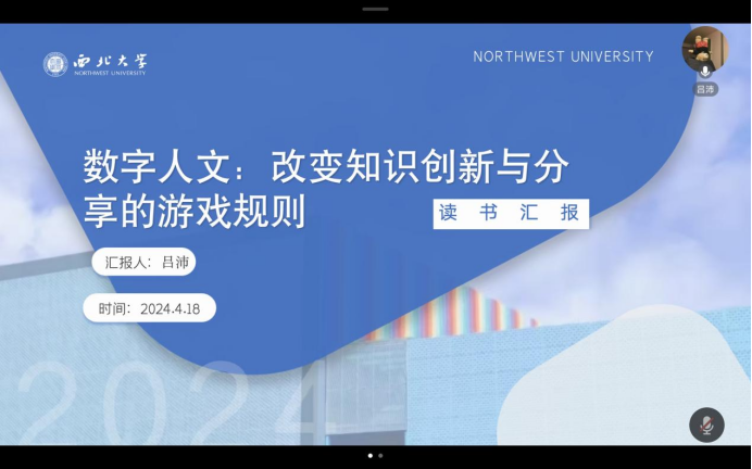 2022级档案学研究生吕沛分享了由安妮·伯迪克等人撰写的书籍《数字人文:改变知识创新与分享的游戏规则》。她首先对书籍内容进行了简要的介绍,包括数字人文的出现和数字人文的发展遇到问题。接着,她对该书的主要内容即数字人文的发展进行阐述,论述了从过去到未来人文知识的形式,重点探讨了数字人文的社会性和社会影响,分析了数字人文项目在当今社会中的现实。最后,她介绍了该书以思想实验的方式提出的5个源于现实但虚构的案例,为同学们开展数字人文研究项目提供描述性模型和参考框架。最后,她分享了自己的阅读感悟,她认为,该书的优势在于多学科的研究背景,具备更广阔的思维方式、直面时代的敏锐性和创新性的写作方式,但也存在着没有进一步梳理当下研究与实践的问题和局限性。