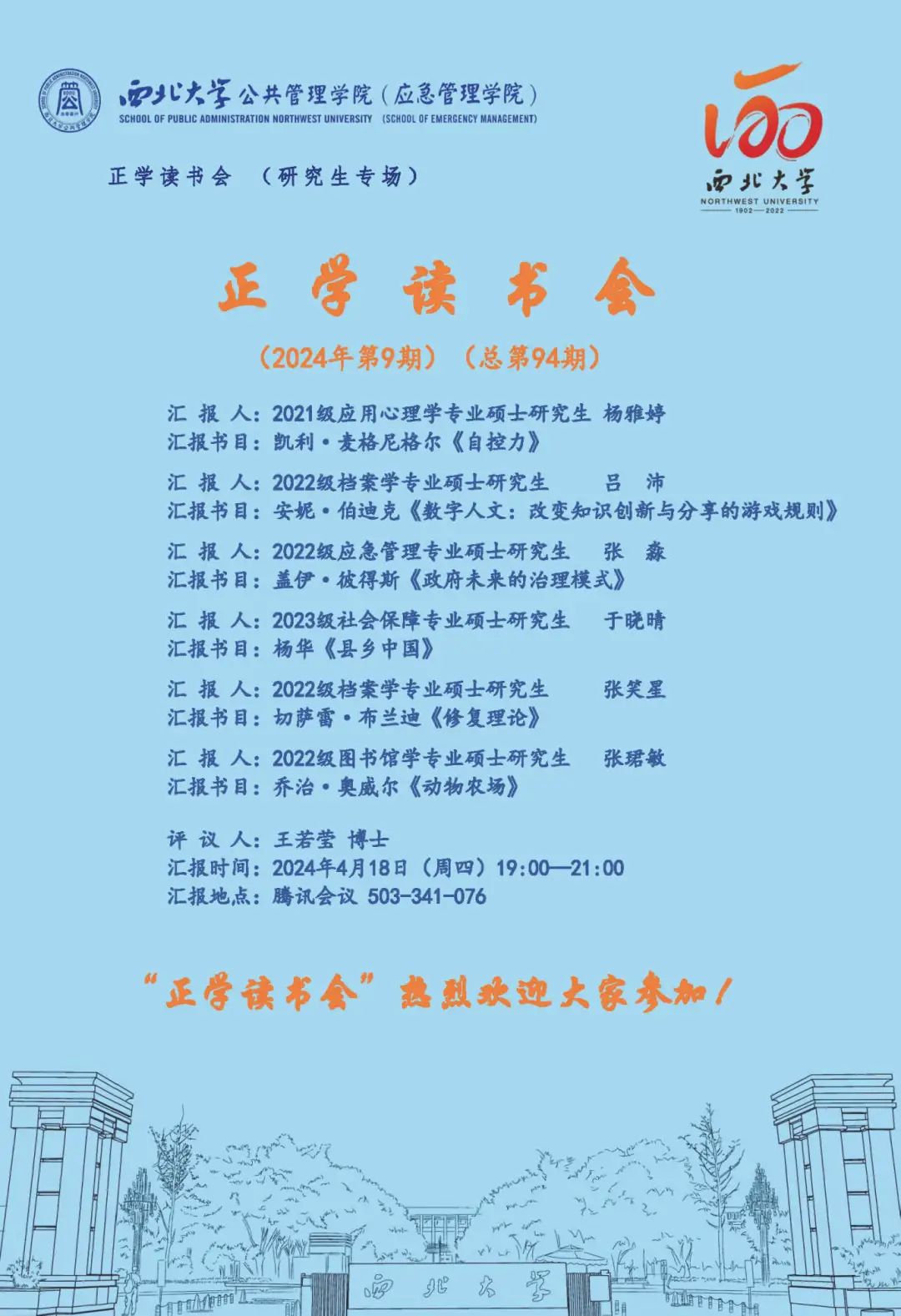 2024年4月18日晚,我院于腾讯会议线上举办了2024年第9期正学读书会。2021级应用心理学专业硕士研究生杨雅婷、2022级档案学专业硕士研究生吕沛、张笑星,2022级应急管理专业硕士研究生张淼、2023级社会保障专业硕士研究生于晓晴、2022级图书馆学专业硕士研究生张珺敏分别作为主讲人进行读书汇报,我学院2023级博士研究生王若莹担任评议人,部分研究生旁听了此次报告会。