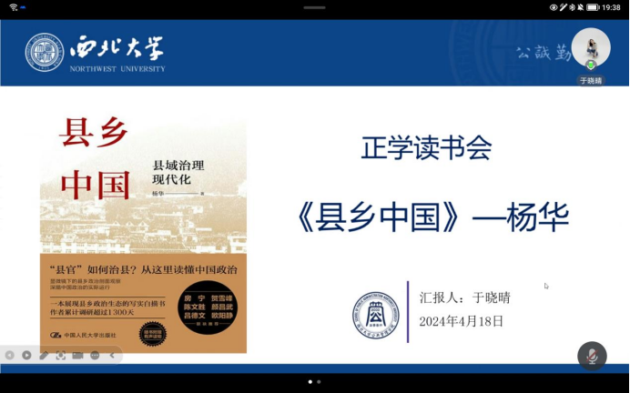 王若莹博士对汇报内容做出点评。她指出于晓晴同学的汇报内容逻辑清新并有自己的思考。同时,她鼓励于晓晴同学在阅读过程中可以学习作者的行文逻辑,并尝试从案例中发现问题、解决问题,为自己的研究课题提供思路。此外,她认为《县乡中国》这本书中提及的县域治理中的问题,对于提升我国县域治理体系的现代化具有很好的理论意义和实践意义,是非常值得阅读和学习的书目。