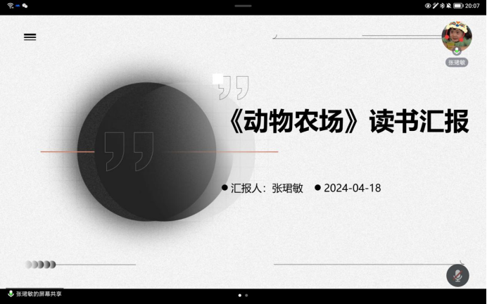 2022级图书馆学专业研究生张珺敏分享的书目是乔治·奥威尔的《动物农场》。首先,她简要介绍了该书背景和作者乔治·奥威尔的生平。随后,她详细讲述了《动物农场》的故事梗概和主题思想,在书中动物们为了摆脱人类的剥削,实现平等自由,起义建立了自己的理想社会,最终却陷入了新的统治和剥削,讽刺了社会主义理想的幻灭。这个故事不仅是对当时苏联等社会主义国家的批判,也对我们现实生活中的权力腐败和理想丧失提出了警示。在角色形象塑造及其特点部分,她深入剖析了作品中的重要角色。例如,拿破仑这一角色代表了权力的腐败和独裁。在文学手法与语言风格环节,她指出该书以简单明了的语言讲述了复杂的故事,通过寓言的形式传达了深刻的现实关怀。最后,她通过探讨《动物农场》的社会意义及现实启示分享了自己的个人感悟与心得体会。