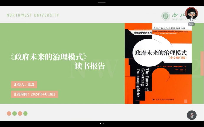 2022级应急管理专业硕士研究生张淼分享的书目是盖伊·彼得斯的《政府未来的治理模式》。她的分享内容主要包括四个方面:写作背景与作者介绍、四种治理模式介绍、对四种治理模式的评价以及自己的反思与展望。她首先详细介绍了本书的核心内容,即政府未来的四种治理模式:参与式政府、弹性式政府、解制式政府、市场式政府。随后,她基于四种治理模式介绍了其进步性与局限所在。最后,她结合中国的基本国情与具体实践,阐述了该书对于当代中国选择合适的政府治理模式的重要指导意义。