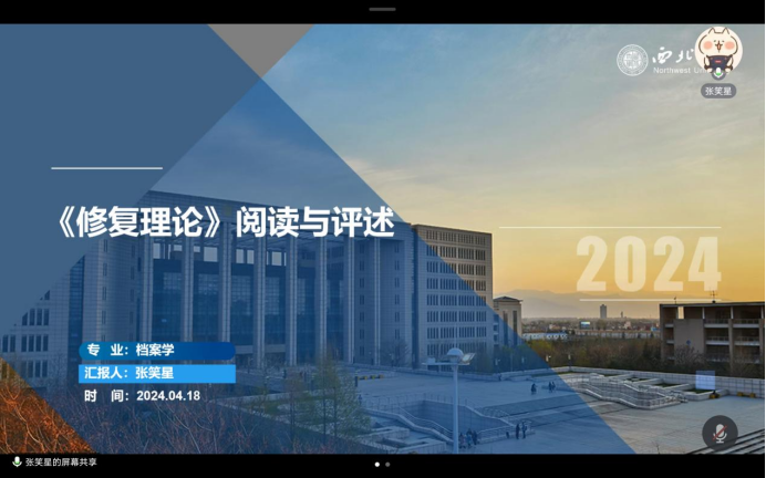 2022级档案学专业硕士研究生张笑星分享的是切萨雷·布兰迪的《修复理论》。她的分享从作者简介、内容评述及自我总结三个方面进行展开。她首先指出《修复理论》对中国物质文化遗产保护界的重要意义,是一场对受到广泛认可的现代保护与修复理论的‘寻根之旅’。随后,她基于书中对“修复”的定义、公理和原则,介绍了布兰迪修复理论的核心概念,其中的关键词包括“艺术作品”“材料”“潜在一体性”“美学史实双重本质”。