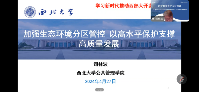 司林波教授汇报的主题为《加强生态环境分区管控 以高水平保护支撑高质量发展》,报告引用了习近平总书记强调的要坚持以高水平保护支撑高质量发展,筑牢国家生态安全屏障。这为推动西部地区加快形成大保护大开放高质量发展新格局,奋力谱写西部大开发新篇章指明了前进方向,提供了根本遵循。报告从生态地位重要性、生态脆弱性、平衡经济发展可持续与环境保护的矛盾以及实现生态效益与经济社会效益共赢层面阐释了加强西部地区生态环境高水平保护的原因。接着引入生态环境分区管控制度以开展高水平保护、推动高质量发展为目标,以空间单位为核心构建起“质量目标-管控单元-准入清单”差异化空间管控体系,为了更好地实施与应用生态环境分区管控应优化生态环境保护空间格局,促进服务高质量发展,推进高水平保护,协同推进减污降碳以及强化“两高”行业源头管控。最后对于加强生态环境分区管控对西部大开发的重大意义而言,其有利于优化生态环境保护空间格局,确保生态安全;有效遏制环境恶化,促进生态修复;推动绿色产业发展,实现经济与环境的双赢。