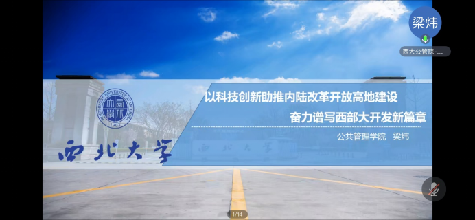 梁炜讲师汇报的主题为《以科技创新助推内陆改革开放高地建设 奋力谱写西部大开发新篇章》,报告伊始便明确了陕西建设内陆改革开放高地,关键在于从外向型经济发展模式向开放型经济发展模式的转变。科技创新是促进经济体从传统外向型经济转向开放型经济的核心要素。紧接着从科技创新支撑内陆改革开放高地建设的优势视角指出,陕西作为科教大省,科教资源优势始终保持全国前列,基础研究积淀深厚,源头创新能力显著;平台承载能力不断增强,科技服务经验日益丰富;知识密集型、技术密集型、高附加值等新产业持续保持高速增长。而优势之下呈现出来的障碍也亟待克服,包括与开放型经济相关的高技术产业研发活力相对不足,与开放型经济相关的科技成果本地承接能力有限。针对科技创新呈现出的障碍,为进一步发挥科技创新支撑作用,要强化顶层设计,充分发挥科技对于内陆改革开放高地的支撑作用;强化开放合作;强化产学研融合与军民深度融合;强化产业-科技融合发展;强化供需对接以及强化绩效评估。