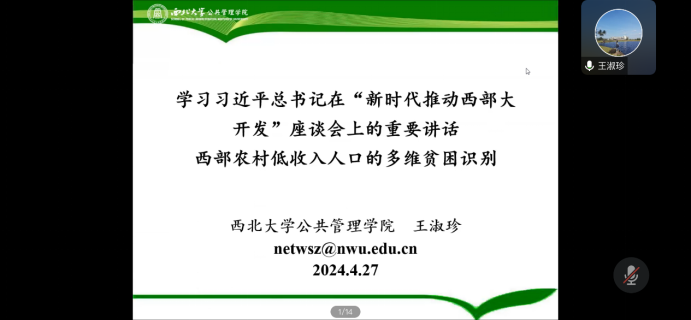 王淑珍教授汇报的主题为《学习习近平总书记在“新时代推动西部大开发”座谈会上的重要讲话——西部农村低收入人口的多维贫困识别》,通过习近平总书记强调的深入实施乡村振兴战略,加大对国家乡村振兴重点帮扶县支持力度,建立低收入人口和欠发达地区常态化帮扶机制,坚决防止发生规模性返贫,确定了研讨的问题为:建立低收入人口和欠发达地区常态化帮扶机制创新西部农村劳动力低收入者的多维贫困识别。接着阐述了贫困相关研究,指出以往研究提出了多维贫困指数及其解构,其中阿马蒂亚·森的能力贫困理论认为,贫困是“可行能力”的多维度剥夺。就相对贫困标准来说,相对贫困更为复杂;我国目前尚无统一的相对贫困判断标准;目前低收入人口的动态监测较为困难。就政策学习带来的启发而言,西部地区应增加农村劳动力人口的教育支出,加强有针对性的技能培训、对农村劳动力人口的全局观念与合作精神教育以及对全面乡村振兴和减贫政策宣传。