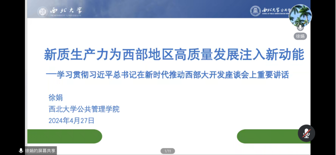 徐娟副教授汇报的主题为《新质生产力为西部地区高质量发展注入新动能一学习贯彻习近平总书记在新时代推动西部大开发座谈会上重要讲话》,报告开始以新时代推动西部大开发座谈会精神为切入点,突出了西部地区在全国改革发展稳定大局中举足轻重。而在实现高质量发展过程中,新质生产力作为其路径是创新起主导作用,摆脱传统经济增长方式、生产力发展路径,具有高科技、高效性、高质量特征,符合新发展理念的先进生产力质态,主要包括技术创新和产业发展两大内容要素,其中技术创新是发展新质生产力的核心要素。聚焦西部地区的新质生产力评估来看,西部地区新质生产力发展整体水平较低,大多数年份落后于全国其他地区;新质生产力稳定增长,地区内部差异较大等,因此要加快培育新质生产力,打造西部高质量发展新动力;加快推进科技创新成果应用,推动发展方式绿色转型;平衡新质生产力与传统生产力的关系,加快传统产业升级和提质增效。