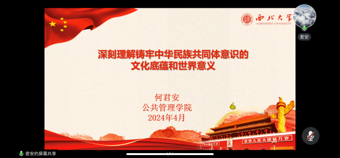 何君安副教授汇报的主题为《深刻理解铸牢中华民族共同体意识的文化底蕴和世界意义》,报告之初引用习近平总书记在新时代推动西部大开发座谈会上的讲话以及在中央民族工作会议上的讲话,明确了铸牢中华民族共同体意识的重要性。聚焦铸牢中华民族共同体意识的历史文化底蕴,通过“中国何以是中国”这一深刻发问,指出了中国是“天下”国家、文明型国家以及现代民族国家。其中,作为“天下”国家,其具备开放性、包容性、平等性及互惠性的特征,明确天下需要治理以及政治正当性来源于人民认可的思想深度以及实行德治、养民、发展各民族的互惠关系、发展各民族的互惠关系、发展公共文化事业、维护天下公共利益的制度与实践;作为文明型国家,文明是立足多民族共存的现实、以赢得多民族认同、促进多民族共同发展为目标并通过建立统一国家来实现这一目标从而显现自身之文明性的文明,是多民族统一的文明型国家;作为现代民族国家,它具有国家形式,与作为历史文化共同体的民族存在根本性差别。聚焦中华民族共同体意识的世界意义,要铸牢中华民族共同体意识、促进多民族共同发展和交流交往交融,才是处理民族问题的大道。