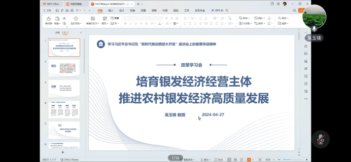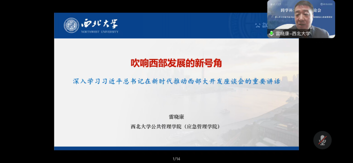 雷晓康教授汇报的主题为《吹响西部发展的新号角——深入学习习近平总书记在新时代推动西部大开发座谈会的重要讲话》,基于地理视角之胡焕庸线、历史角度之史家评论以及习近平在新时代推动西部大开发座谈会上的最新定位证实了西部地区的战略地位。紧接着从宏观时间线的角度回顾了党领导西部大开发的伟大历程,指出了党中央高度重视西部地区发展,始终将西部地区发展放在全国发展大局的重要位置。最后阐述了西部地区发展的内容要素。其中包括,以产业为主攻方向,要坚持把发展特色优势产业作为主攻方向,因地制宜发展新质生产力;以生态为高压红线,要坚持以高水平保护支撑高质量发展,筑牢国家生态安全屏障;开放作为筑造高地,要坚持以大开放促进大开发,提高西部地区对内对外开放水平;统筹发展与安全关系,提升能源资源等重点领域安全保障能力;以民生为大国之基,要坚持推进新型城镇化和乡村全面振兴有机结合,在发展中保障和改善民生以及坚持铸牢中华民族共同体意识,切实维护民族团结和边疆稳定。