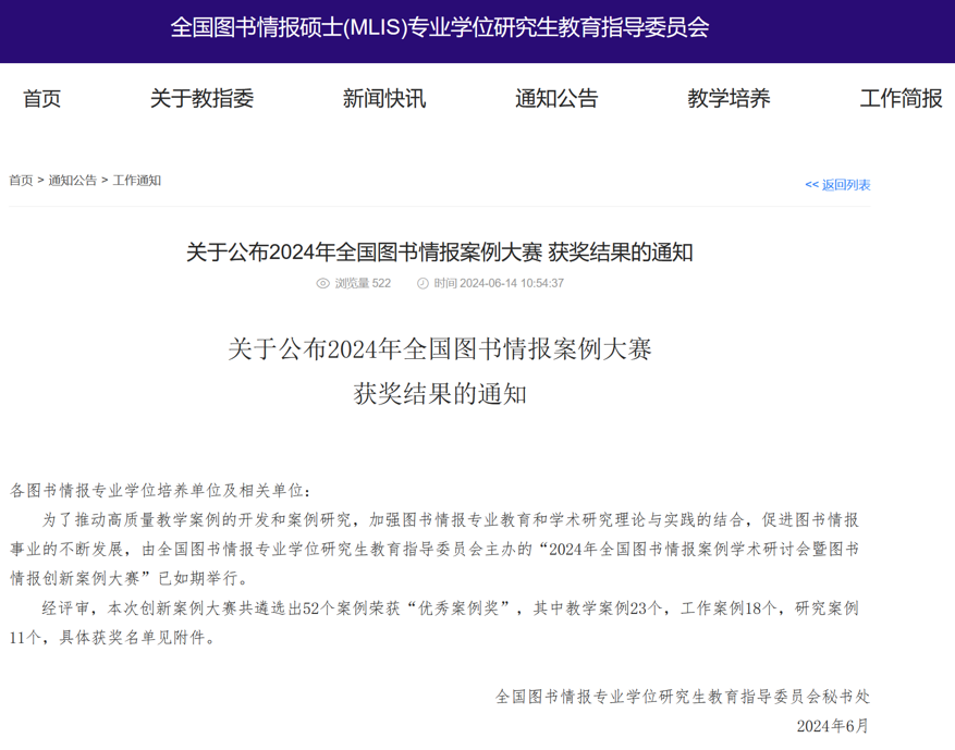 (关于公布2024年全国图书情报案例大赛获奖结果的通知)