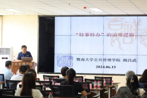 暨南大学我学院颜昌武教授做了题为《“特事特办”的治理逻辑》的主题报告。他追溯了该政策的起源,指出其作为改革开放初期在经济特区试行的一项新政策,目的是通过创新来应对特殊情况。随后,详细阐述了“特事特办”的应用范围,以及“特事特办”的实施机制和背后的精神价值。他指出,“特事特办”的实施过程中面临的一些挑战,政府应如何在遵守正规制度的同时灵活应对特殊情境。“特事特办”有其合理性必要性,但也存在潜在的问题和负面影响,在执行过程中要仔细权衡各种价值和利益,确保政策的正面效应最大化。