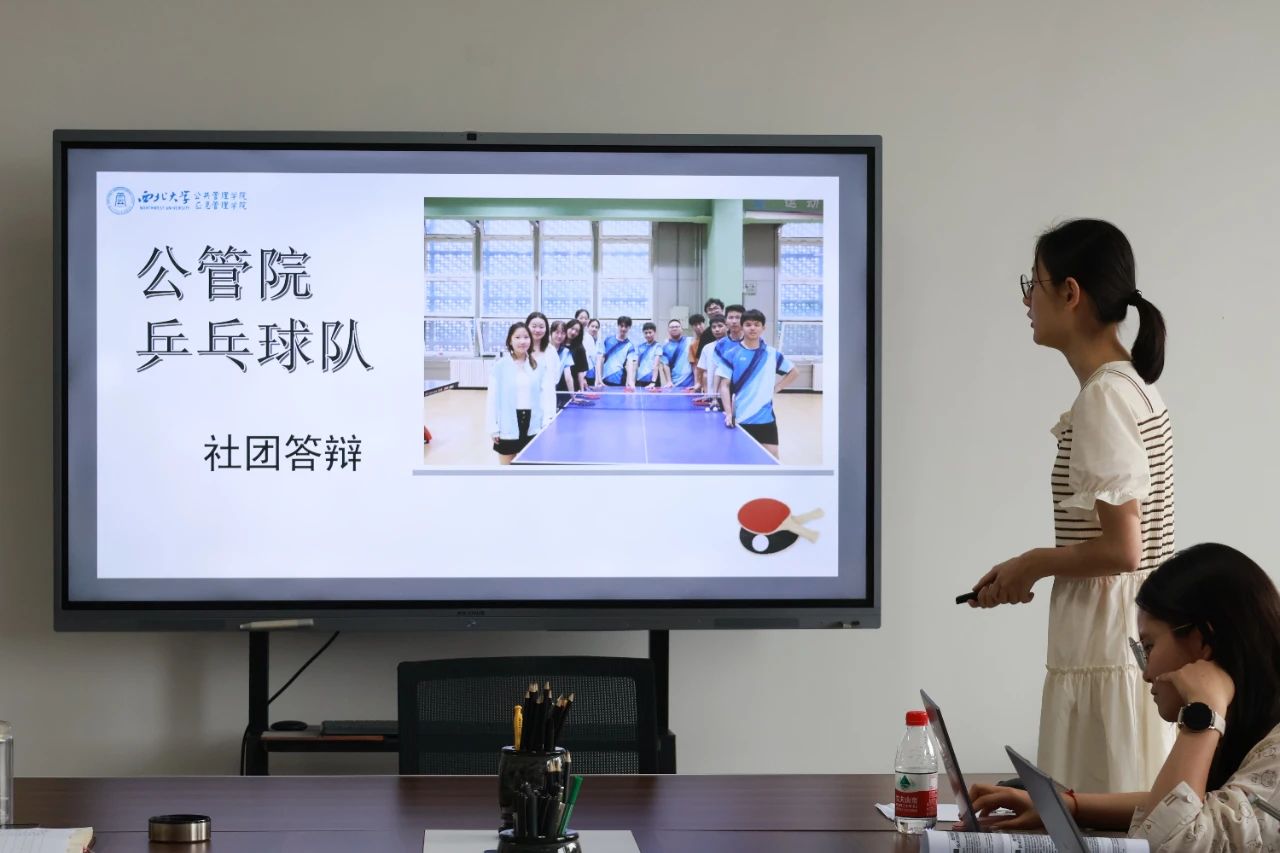(2023级图书与档案管理类专业本科生于文心介绍汇报了我院乒乓球队的工作具体情况)