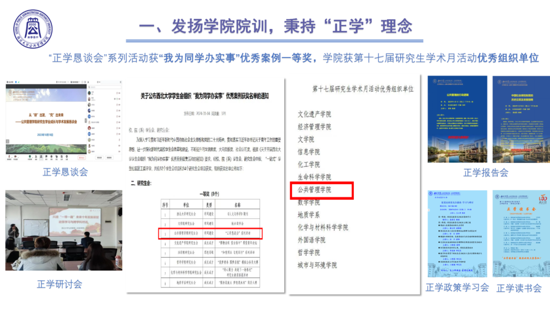 1.发扬学院院训,秉持“正学”理念。“正学恳谈会”系列活动获“我为同学办实事”优秀案例一等奖,学院获第十七届研究生学术月活动优秀组织单位。