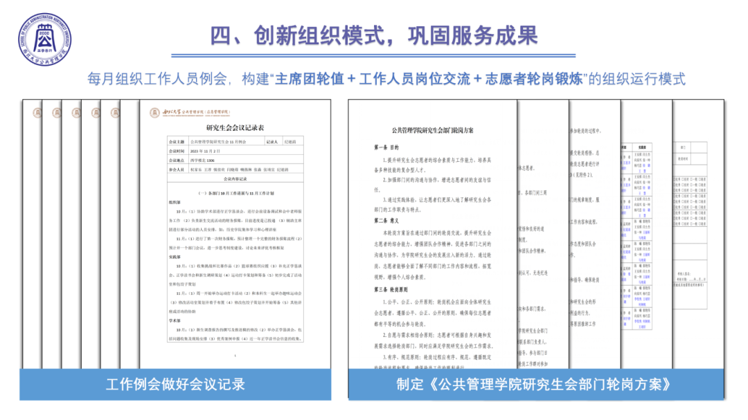 4.创新组织模式,服务成果更加有效。每月组织工作人员例会并做会议记录。构建“主席团轮值+工作人员岗位交流+志愿者轮岗锻炼”的组织运行模式,加深志愿者对研究生会工作的理解。
