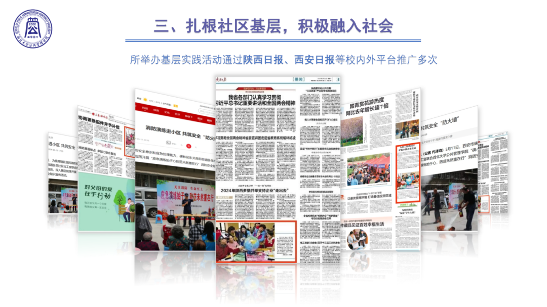 3.扎根社区基层,社会融入更加积极。所举办基层实践活动通过陕西日报、西安日报、秦闻等多家省市级媒体平台推广多次。