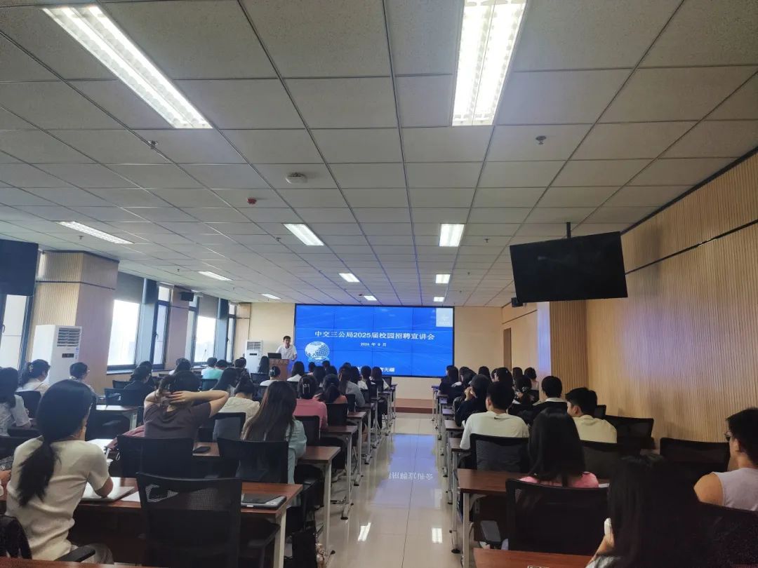首先,中交三公局相关工作人员向与会师生播放了中交三公局的企业宣传片,生动展示了公司的辉煌成就和未来发展蓝图。他从多个维度详细介绍了中交三公局的发展历史和综合实力。他还着重介绍了中交三公局为新员工提供的职业发展路径和薪酬福利体系。他提到,公司注重人才培养,为新员工提供一年的成长计划、两年的成才规划以及三年的独当一面目标。此外,公司还提供包括六险三金在内的全面薪酬福利,以及海外工作的高薪机会和丰富的休假制度,确保员工在工作与生活中实现平衡。