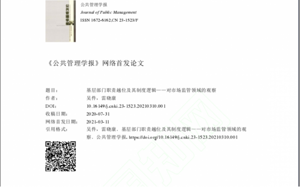 我院雷晓康教授任通讯作者,与清华大学吴件博士合作完成的论文《基层部门职责越位及其制度逻辑——对市场监管领域的观察》一文在《公共管理学报》2021年3月11日线上发表。