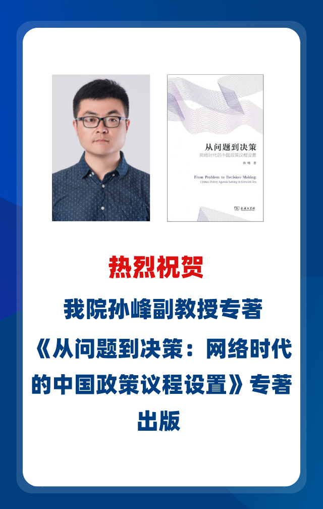 近日,我院孙峰副教授学术专著《从问题到决策:网络时代的中国政策议程设置》在商务印书馆出版。该书指出,党的十九届四中全会强调“形成科学决策机制”、推进国家治理体系和治理能力现代化,而公共政策是国家治理现代化的重要工具。网络时代情境下问题丛生,如何筛选出“真问题”是科学决策首要环节,研究作为决策筛选机制和治理现代化端口的政策议程设置重要且紧迫,该书针对上述问题进行探索,分为三大篇章。
