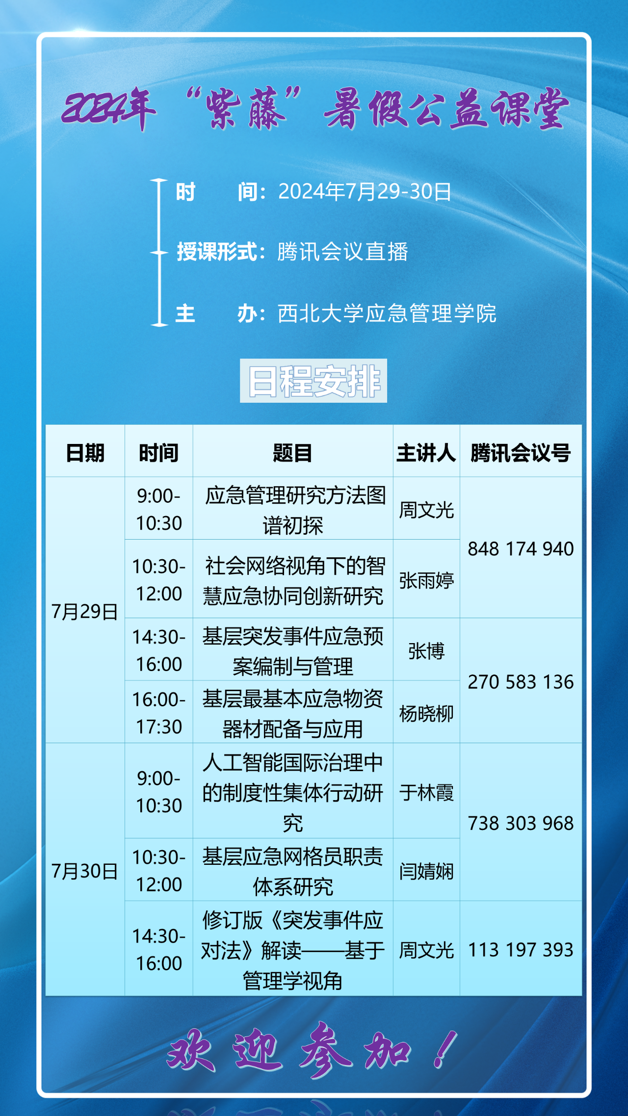 联盟公益 | 2024年“紫藤”暑假应急管理公益课堂日程安排
