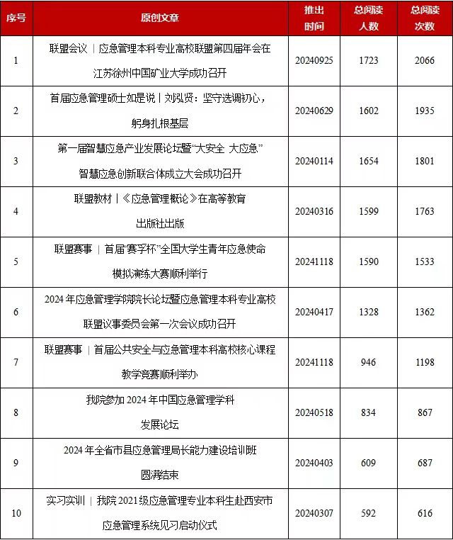 2024年,是新中国成立75周年,是实现“十四五”规划目标任务的关键一年。在“全灾种、大应急”工作格局下,我校应急管理学院在学院领导班子的带领下,持续推进“新文科”背景下的应急管理学科交叉建设,不断创新人才培养模式。在学科建设、产学融合、学术交流、人才培养等方面取得一系列成绩。2024年,“西大应急”共推出160期推送,累计阅读量为19.7万次;截至2024年12月29日累计关注人数3791人,对比2023年12月31日新增798人。在辞旧迎新之际,我们推出《“数”说2024》特别栏目,以图文并茂的形式对一年的工作进行分类盘点,为您呈现“西大应急”微信公众号2024年度的工作开展情况。