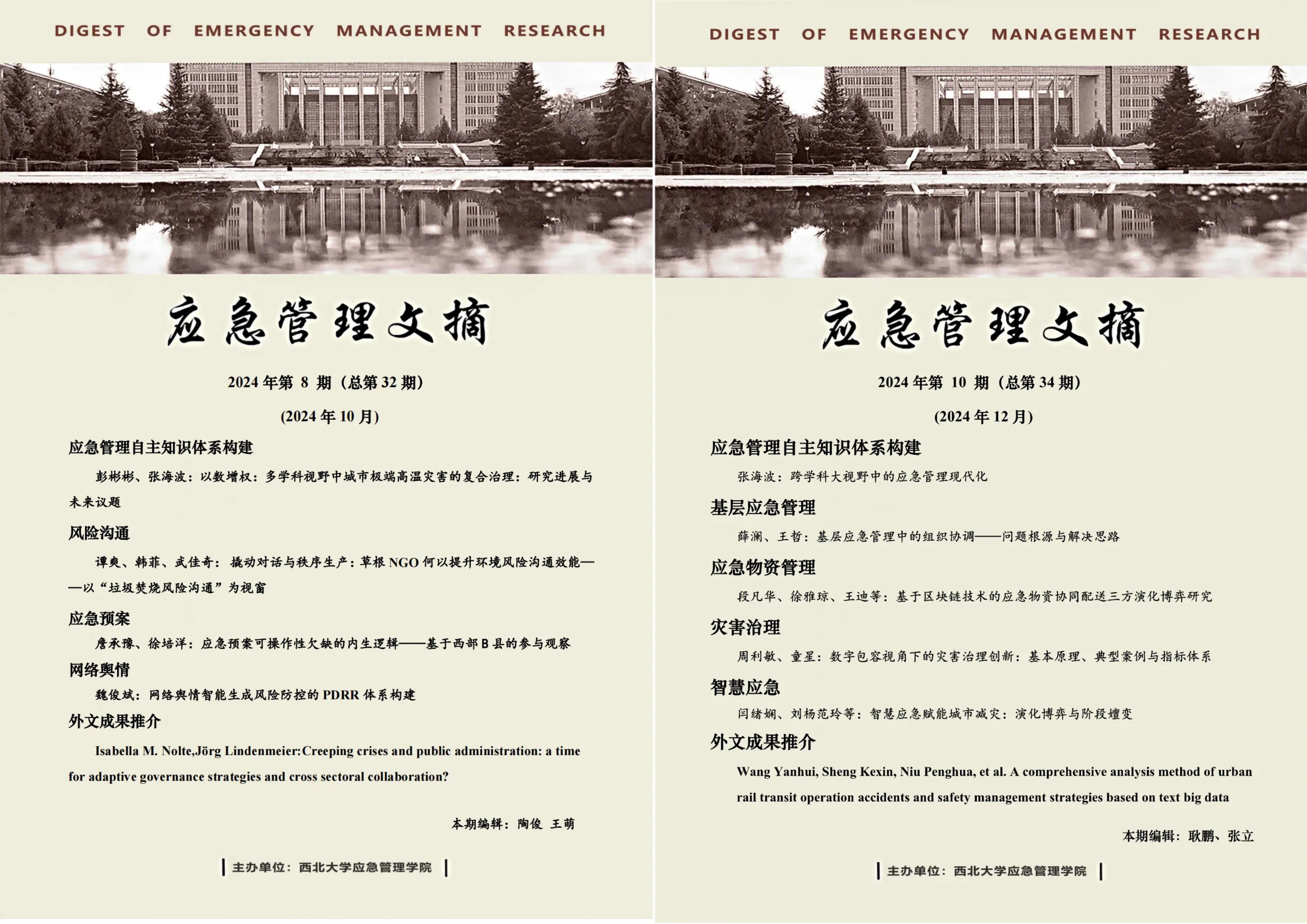 2024年,西大应急开辟了下载专区,以便学界和行业同仁下载、交流和使用。由应急管理本科专业高校联盟(虚拟会议型联盟&学术共同体)倡议、我校应急管理学院主办的《应急管理文摘》共推出34期。其中,2024年已先后推出10期。从2021年10月开始,每月推出一期《应急管理文摘》,选取应急管理研究的最新文献编辑成册,并根据涉及的领域和范围,每期将设立不同栏目进行整理归类,通过高质量的新刊论文与应急管理学者们对话,共同探讨应急管理的基本原理、内在规律、理论创新和实践探索。