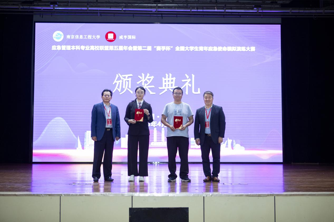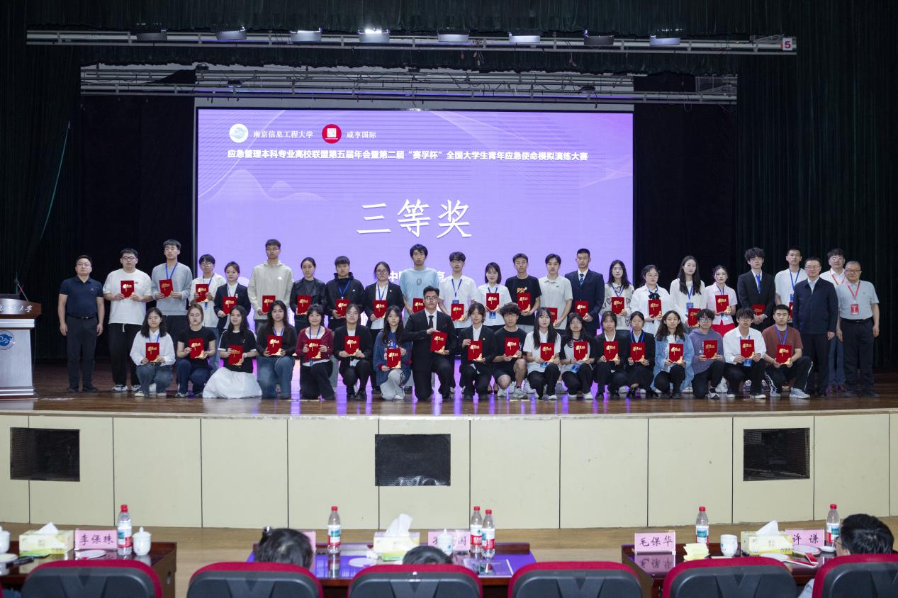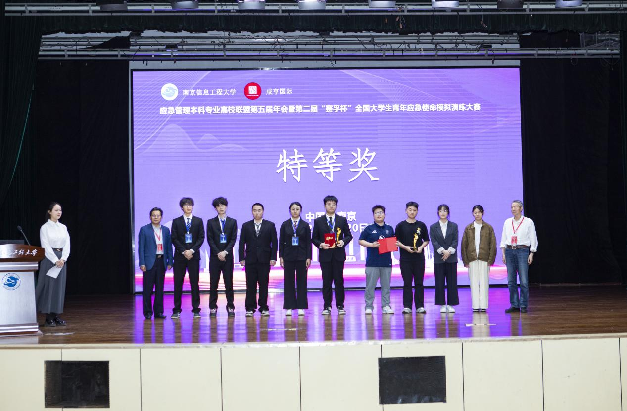 同时,第二届“赛孚杯”全国大学生青年应急使命模拟演练大赛也在大会期间举行。本届大赛涵盖理论考核、虚拟仿真实战和决赛答辩三个环节,全面检验学生的应急决策能力与技术创新水平。防灾科技学院的“顺顺顺利队”与苏州工学院的“虞战虞勇队”的2支队伍获特等奖,南京师范大学的“安全π队”、我校的“我校应急管理二队”、南京信息工程大学的“第一梯队”等5支队伍获一等奖,广西警察学院防的“桂警应急智行团”、暨南大学的“暨急如律令队”、河南理工大学“慧聚智策”等8支队伍获得二等奖,延安大学的“风云智衡队”、南京师范大学的“树上安全的鸟儿成双队”、中国地质大学(武汉)的“南望应急智援队”等38支队伍获得三等奖,防灾科技学院的唐毅和苏州工学院姚嘉杰老师获优秀指导教师奖。