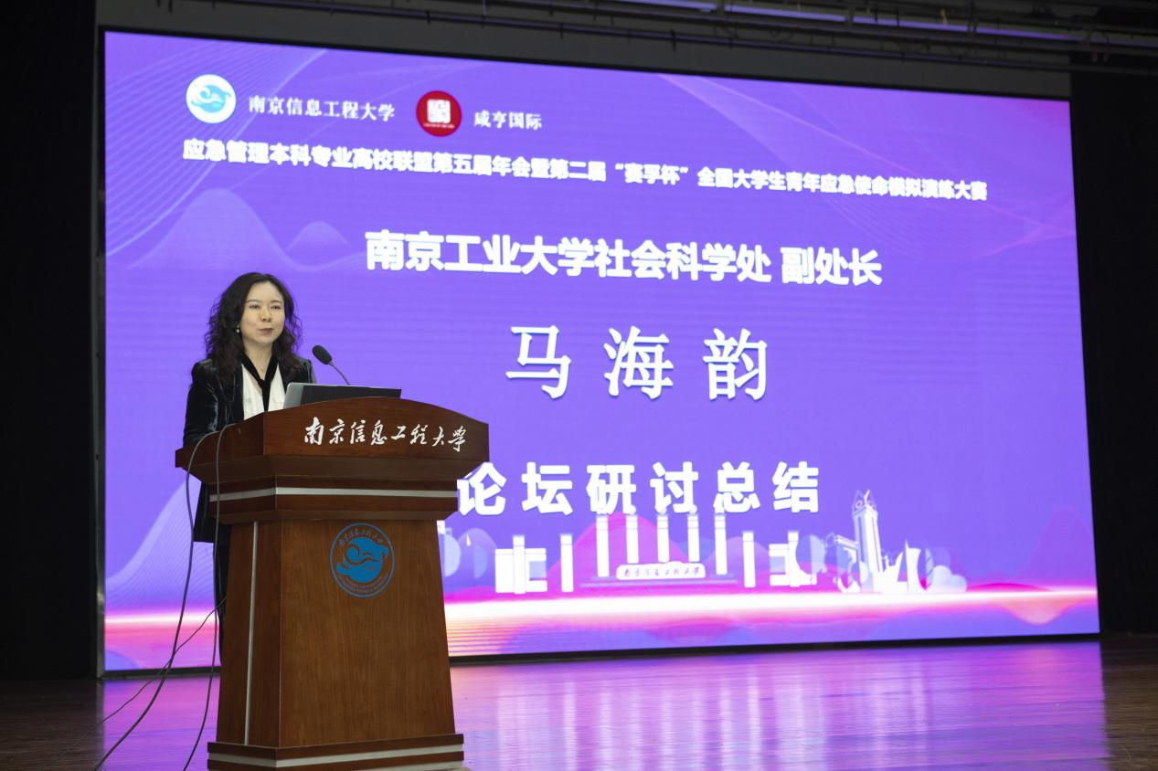 闭幕式由南京信息工程大学应急管理学院副院长顾湘主持。论坛代表马海韵首先汇报了本次学术研讨的成果,随后举行了年会优秀论文颁奖、学生竞赛颁奖和下届联盟会议承办交接仪式。雷晓康和薛勇将会议承接给暨南大学唐攀教授,宣布下一届会议将由暨南大学承办。南京信息工程大学应急管理学院成芳书记在总结中对会议的成功举办给予高度评价,强调学科协作与创新实践在应急管理中的重要性,为本届论坛画上了圆满句号。