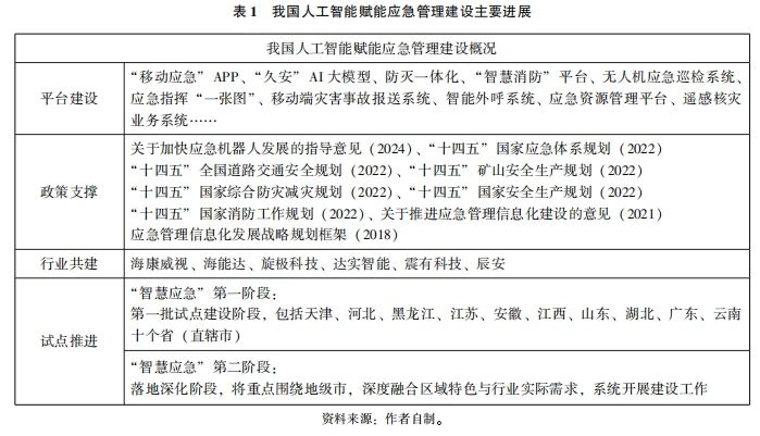 我国人工智能赋能应急管理建设已进入场景深化与系统化推进阶段。2018年应急管理部组建以后,国家应急管理信息化建设拉开帷幕。随着5G通信、大数据分析、物联网、遥感遥测、虚拟仿真、人工智能等技术的深度应用,全国各地大中城市逐步构建起覆盖灾情监测、预警研判、应急处置及资源调度的全链条智能感知与指挥平台,应急管理的科学性、精准性、及时度和效率大幅提升。2020年以来,以新一代生成式AI为代表的人工智能技术及数智产业崛起,我国应急管理的信息化、数字化建设迈向了数智化阶段,已历经了从实验室摸索到应用场景的落地、从单一功能到生态构建的系统性突破。当前,我国人工智能赋能应急管理现代化建设在平台构建、政策支撑、行业共建、试点推进等各方面全面发力。平台构建方面,“移动应急”APP、“久安”AI大模型、防灭一体化“智慧消防”平台、无人机应急巡检系统等得以建成和投入使用;政策支撑方面,《应急管理信息化发展战略规划框架(2018—2022年)》《应急管理部关于推进应急管理信息化建设的意见(2021)》《应急管理部工业和信息化部关于加快应急机器人发展的指导意见(2024)》等政策文件相继出台;行业共建方面,海康威视、海能达、旋极信息、达实智能等AI应急产业上市公司规模不断扩大,人工智能应急产业招投标项目数量也急剧上升;体系化推进方面,随着应急管理部第一批“智慧应急”试点建设名单已于2021年底完成建设目标,以先进典型带动全国“智慧应急”建设整体发展已经具备条件。2022年试点建设进入第二个阶段,即落地深化阶段,重点围绕地级市地域与业务特色开展建设工作,并成功建成东莞“莞系列”智慧应急平台、深圳1000多个“应急管理服务智能微站”、常州“常安码”企业风险管控模块等差异化特色智慧应急模式。当前,人工智能赋能应急管理建设实践,更加体现着精细化治理和新生态融合共建的态势,我国“智慧应急”战略不断取得新的成绩,为建设更高水平的平安中国提供更为有力的支撑(见表1)。