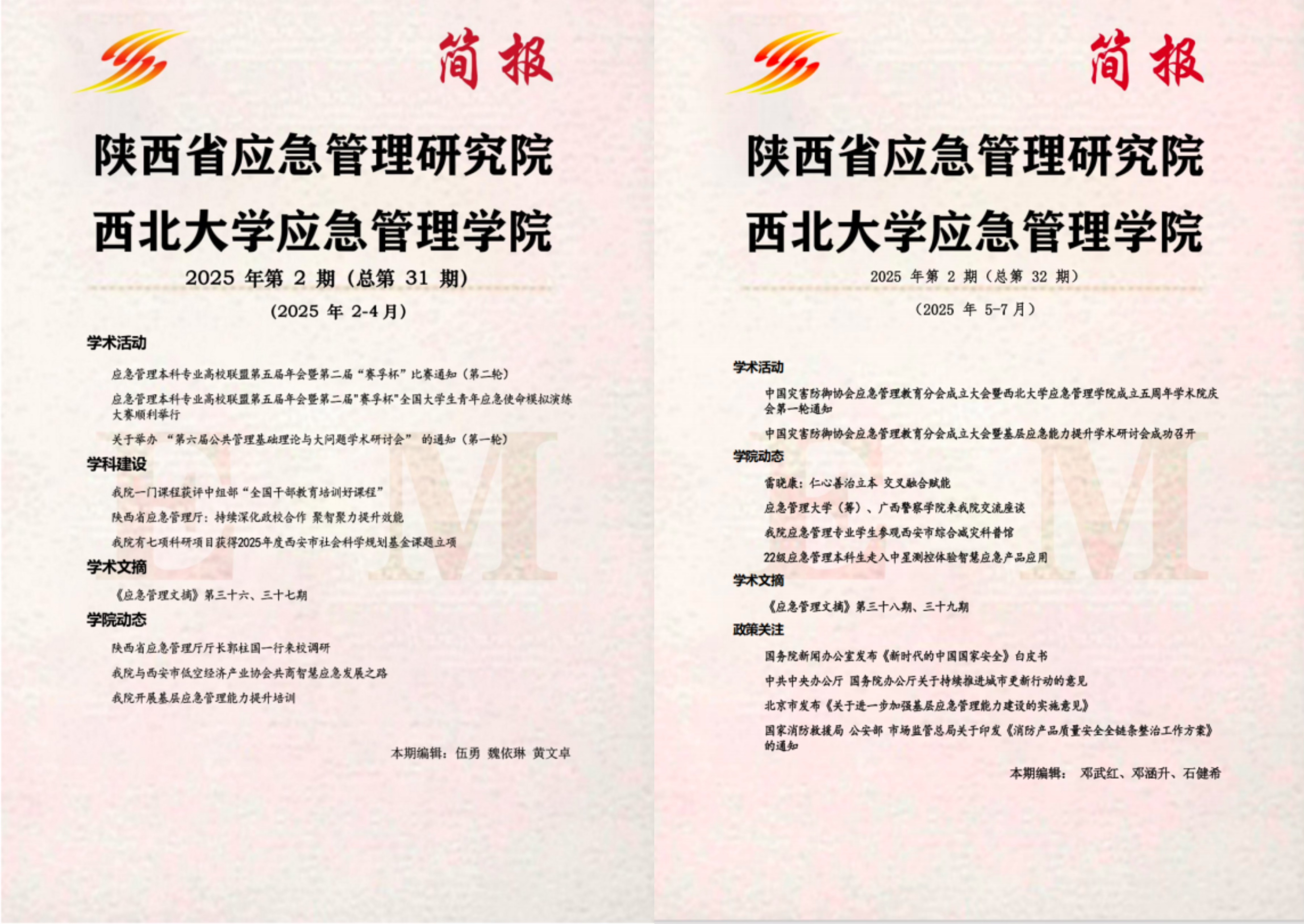 由我校应急管理学院主办的《应急管理简报》已推出32期。其中,2025年共推出2期,每一期《应急管理简报》都会从学术活动、政策关注、学术文摘、学院动态等多个维度总结复盘一定时间段内应急管理团队的工作情况。