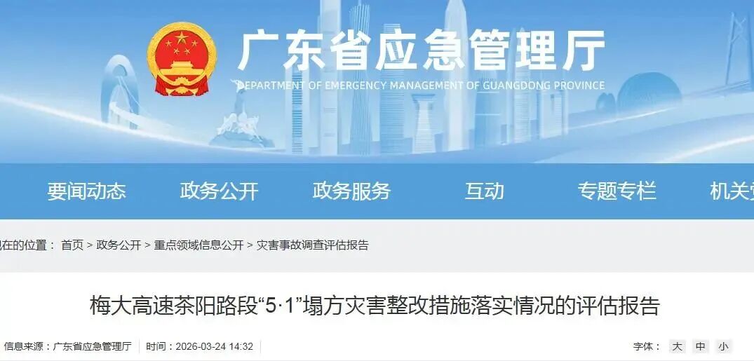 近日,广东省应急管理厅发布了《梅大高速茶阳路段“5·1”塌方灾害整改措施落实情况的评估报告》(以下简称“报告”)。