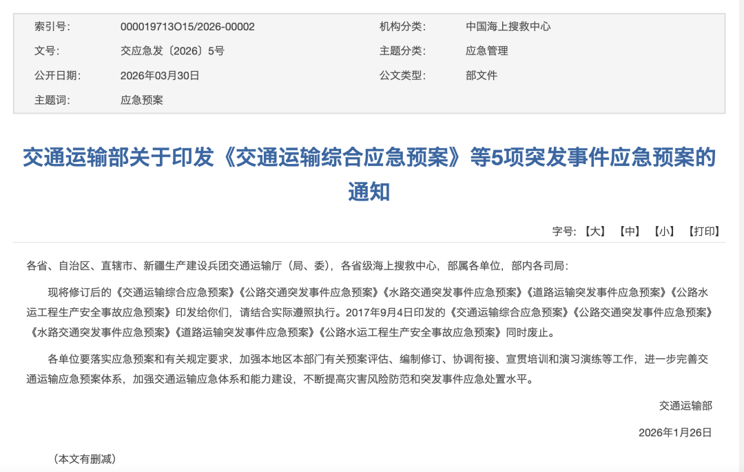 出现下列情形之一时,交通运输部将组织修改完善本预案: